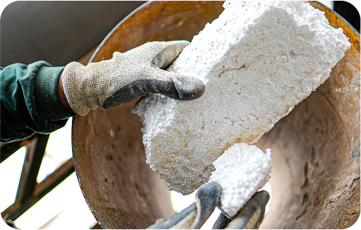 Materiais como concreto, madeira, metais e plásticos são recebidos com rigor técnico e passam por umidificação para evitar poeira e proteger o ambiente de trabalho.
